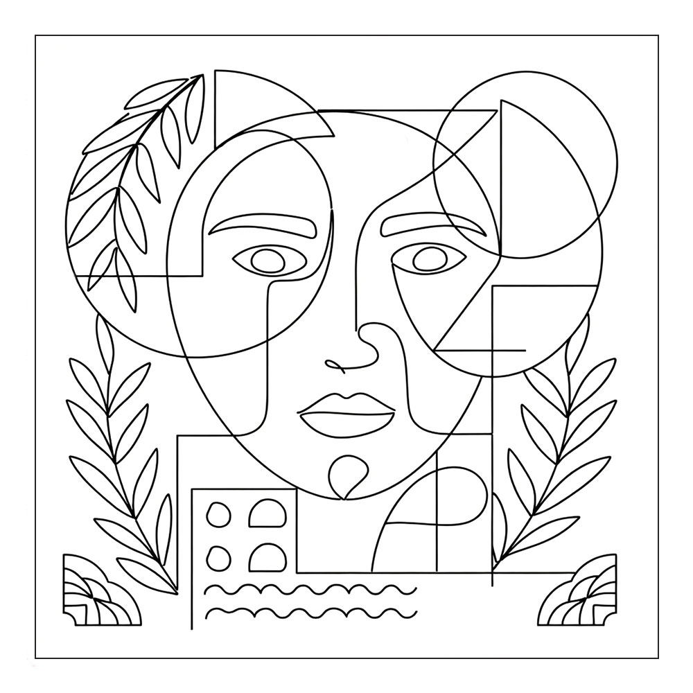 幾何学的な図形と植物に囲まれた抽象的な顔を描いた塗り絵です。キュビズムを思わせる独特のデザインで、個性的な色使いを楽しみたい方におすすめの一枚です。