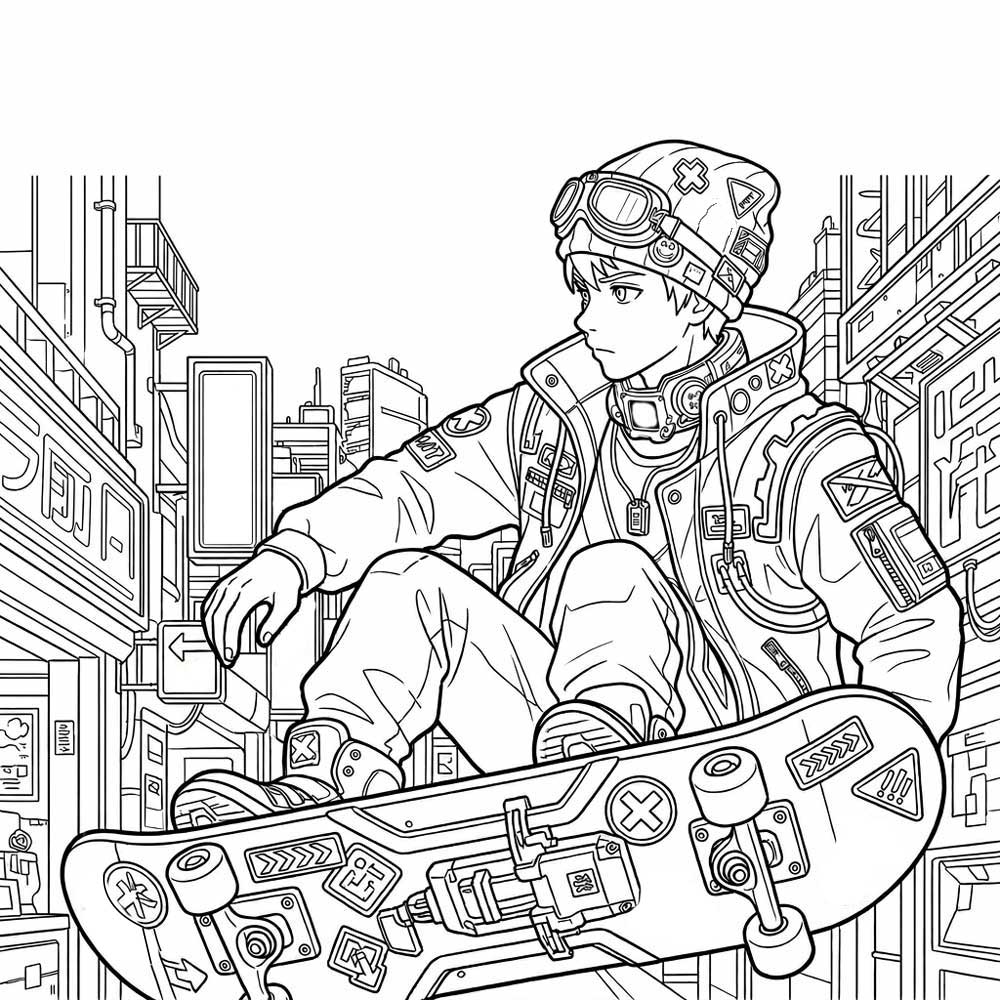 未来都市でスケートボードをする少年の塗り絵。細かい描写で塗りごたえがあるかと思いますが、完成したらかっこいいい一枚になるかも。